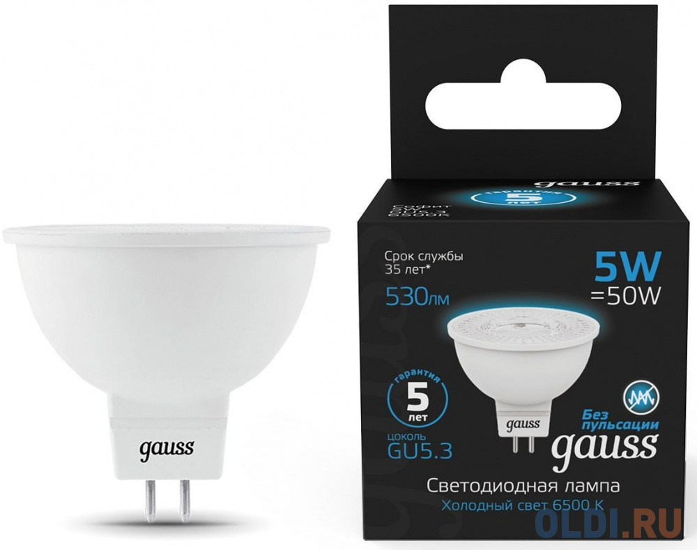 Лампа светодиодная Gauss 101505305 5Вт цок.:GU5.3 рефлек. 220B 6500K св.свеч.бел.хол. (упак.:10шт)![]()