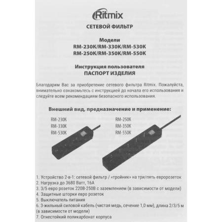 Сетевой фильтр Ritmix RM-350K, 3м, черный