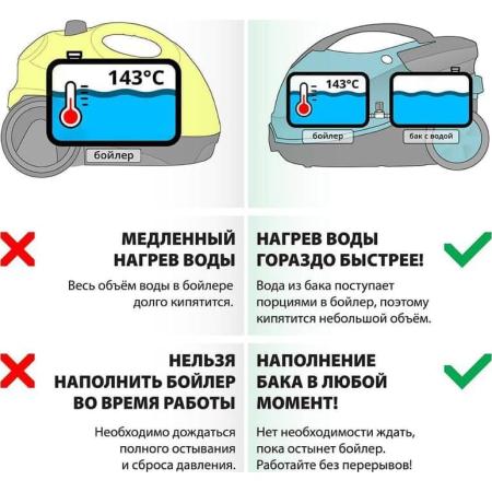 Вода заливается в бачок, емкостью 1 500 мл, и нагревается до 143°С всего за три минуты. Такой объем бачка увеличивает время применения до 16 минут. Мощность пара, максимальный показатель которой составляет 4 бара, можно регулировать. Специальная лампа-индикатор укажет на уровень нагрева воды и готовность парогенератора к работе. Электронная система контроля количества воды не позволит использовать агрегат, если его бачок опустел. В комплекте с этим приспособлением для уборки вы получите: точечное сопло, насадку для мытья окон/дверей, щетки для одежды, ковров и пола, круглые щетки-насадки с металлической и полимерной щетиной, держатели для одежды и для шнура питания, салфетку махровую, мерный стакан, удлинительную пластмассовую трубку и утюг. Стандартная гарантия действует 2 года с момента покупки.